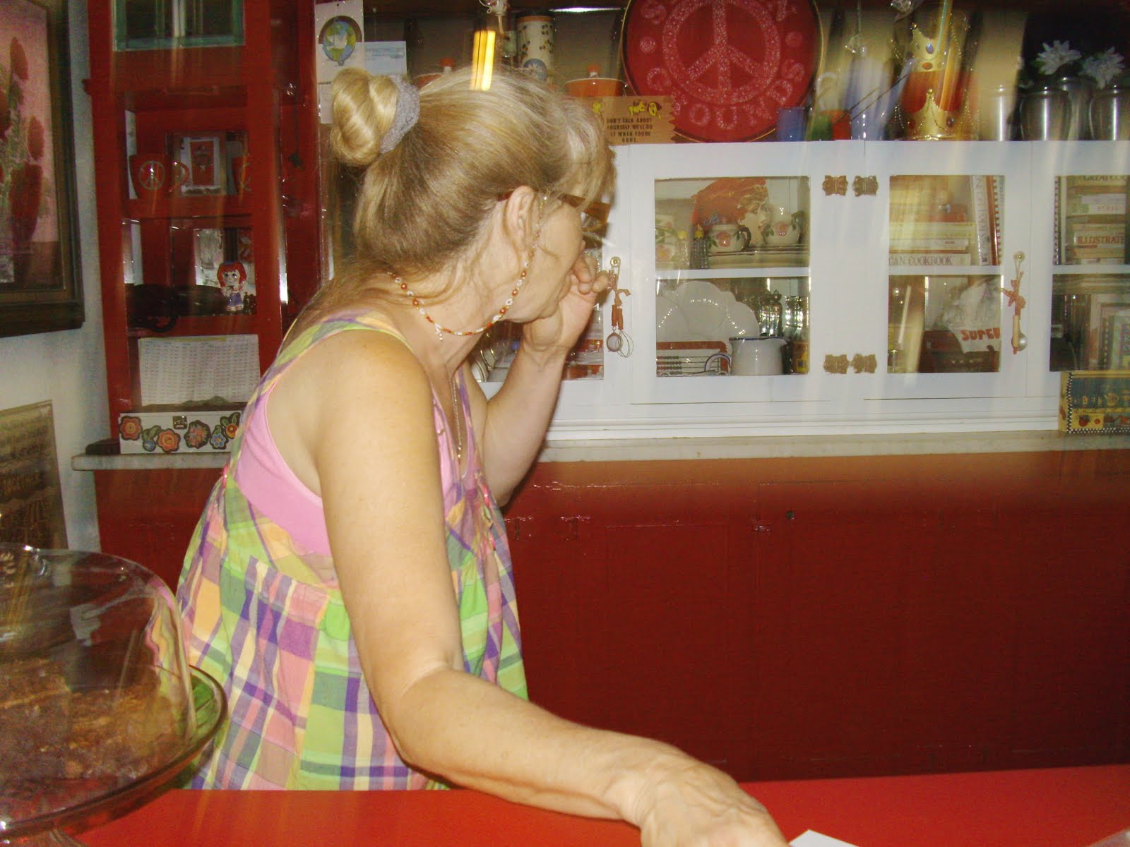 There is located in this fair mountain town, a small eating place called The Stompin' Grounds  Coffee House. See the first picture up there?  That is my new BFF (best friend forever).  We walked in and this lady had the sweetest smile of welcome. Her name is Jan Miller and she is the proprietor of this place.  See there behind her is a pink peace sign that someone made her. The Peace Sign along with the one outside that said "Hippies use back door" told me I was in my kind of place.